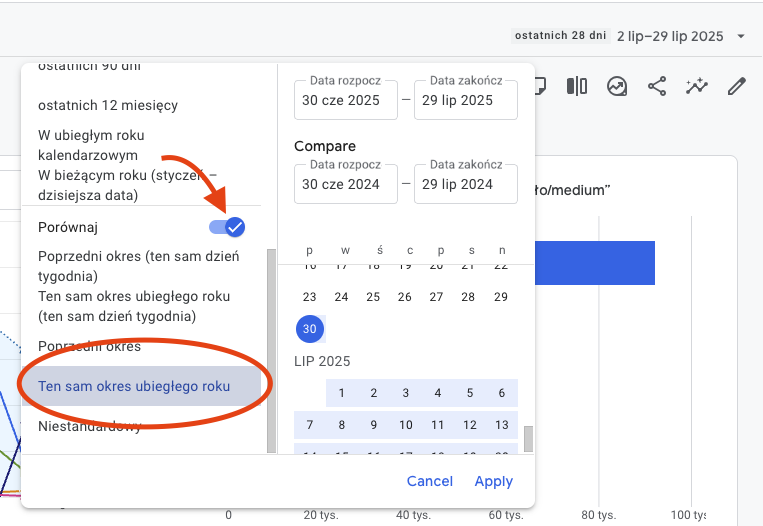 Na powyższym przykładzie zaznaczyłam ostatnie 30 dni, włączyłam porównanie i kliknęłam Ten sam okres ubiegłego roku. Na koniec zapisujemy w prawym dolnym rogu kalendarza i już możemy przejść do analizowania danych.
