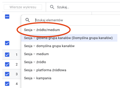 Żeby jeszcze bliżej przyjrzeć się konkretnym źródłom ruchu, możemy zmienić wyświetlanie tych danych z kanałów, na precyzyjne źródło. W tym celu klikamy na opcje nad listą w tabelce i zmieniamy z Sesja – główna grupa kanałów na Sesja – źródło/medium.