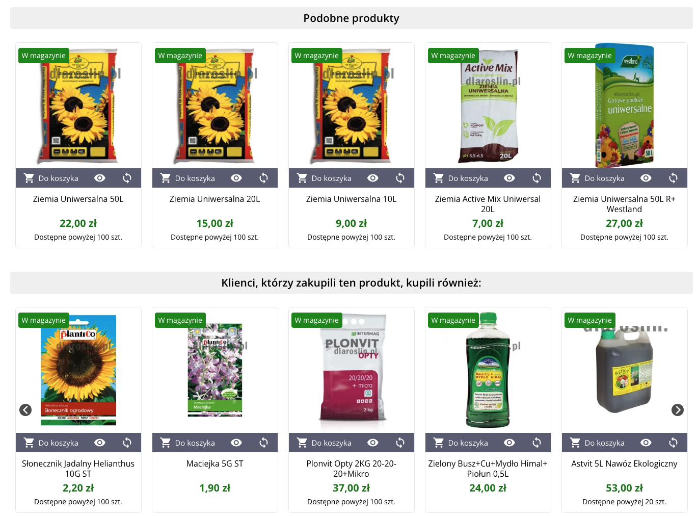 W poniższym przykładzie sprawdziliśmy jak to wygląda np. w przypadku ziemi uniwersalnej. Pod kartą produktu znajdują się tutaj dwa moduły. Pierwszy – podobne produkty, prezentuje inne podłoża uniwersalne. Klient może wybrać innego producenta lub inną wielkość opakowania. Drugi moduł – klienci, którzy kupili ten produkt kupili również. I w tym miejscu mamy już zupełnie różne produkty. Z naszej perspektywy nie wiemy, czy rzeczywiście znalazł się tu asortyment dobierany na podstawie historii zamówień, ale tak to powinno działać.